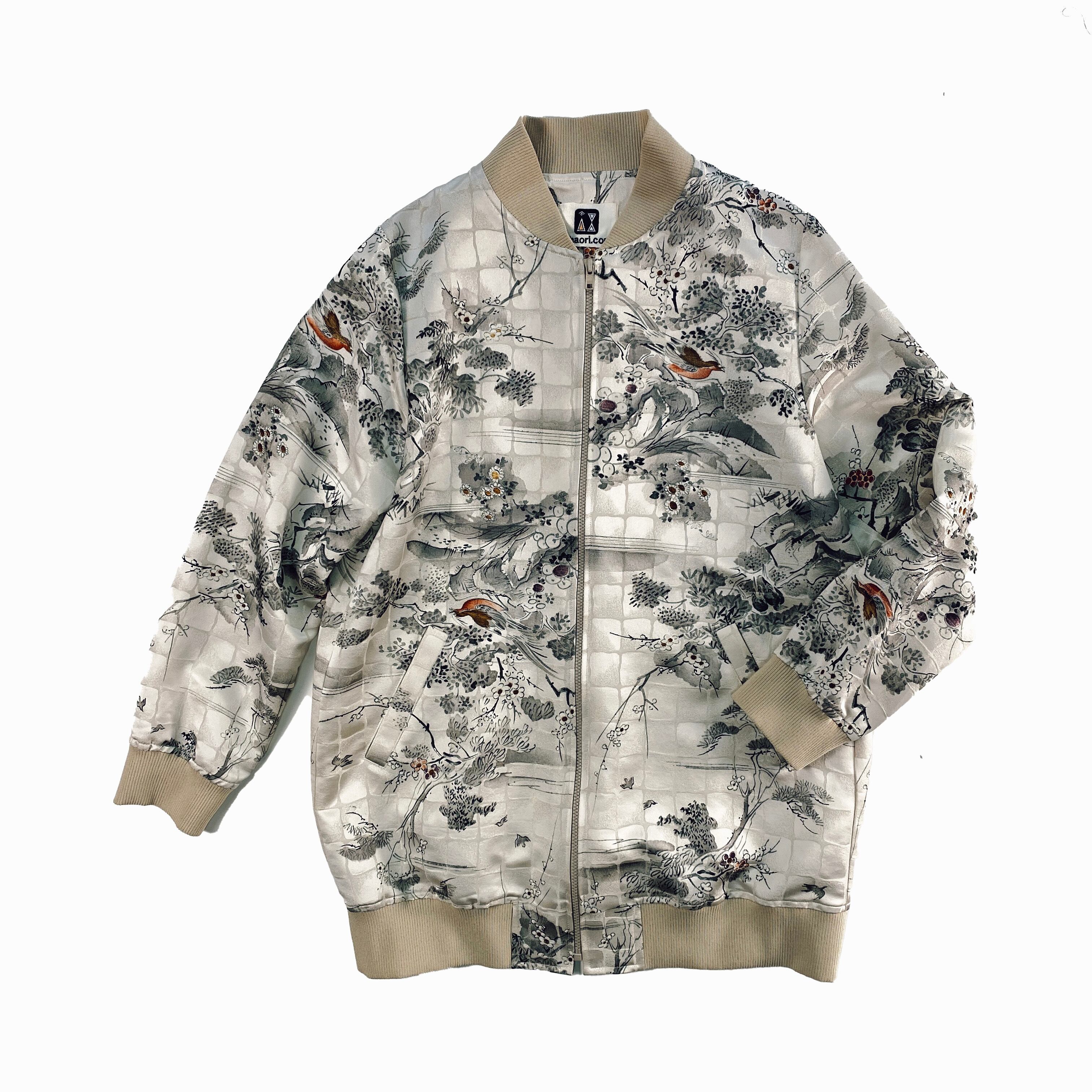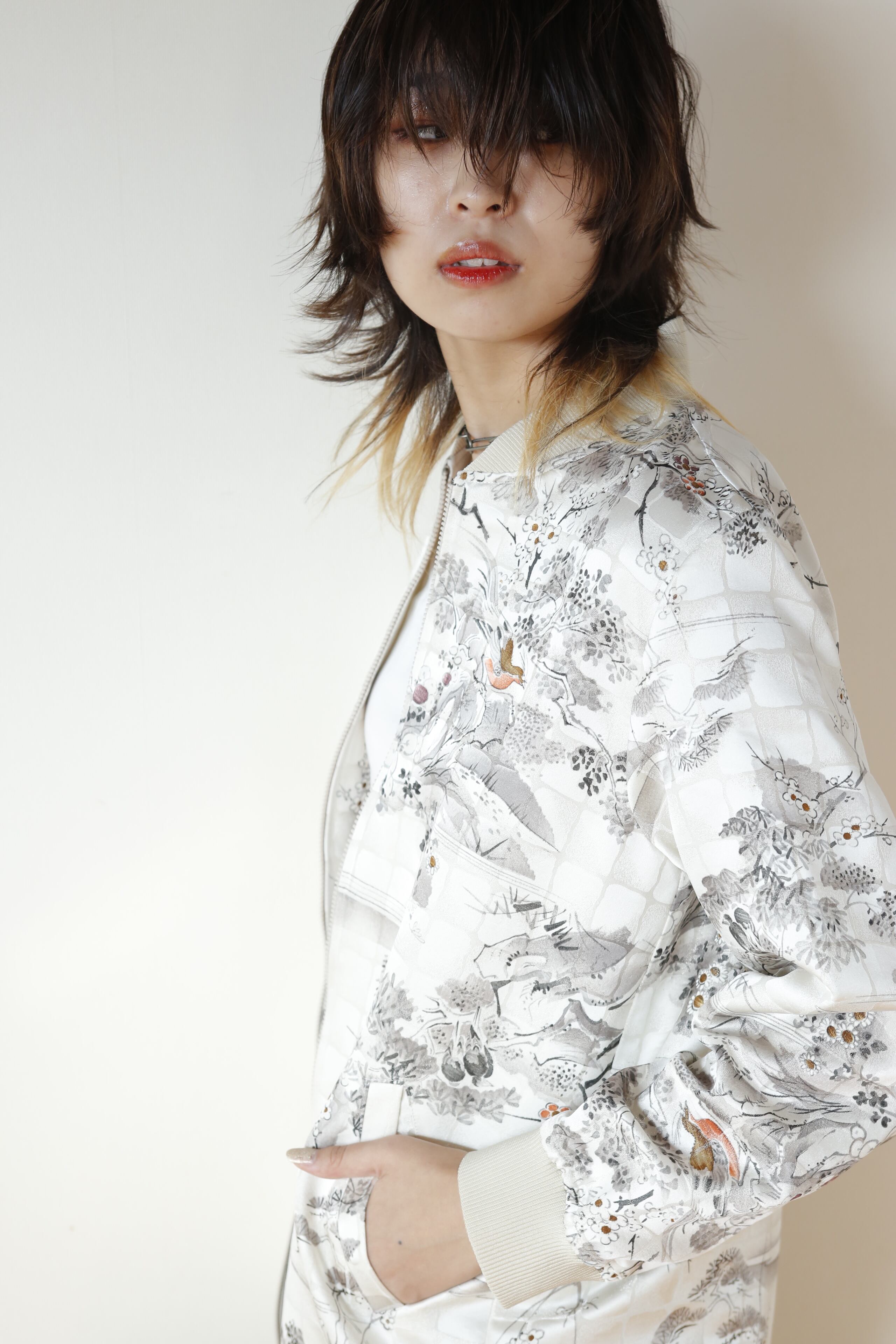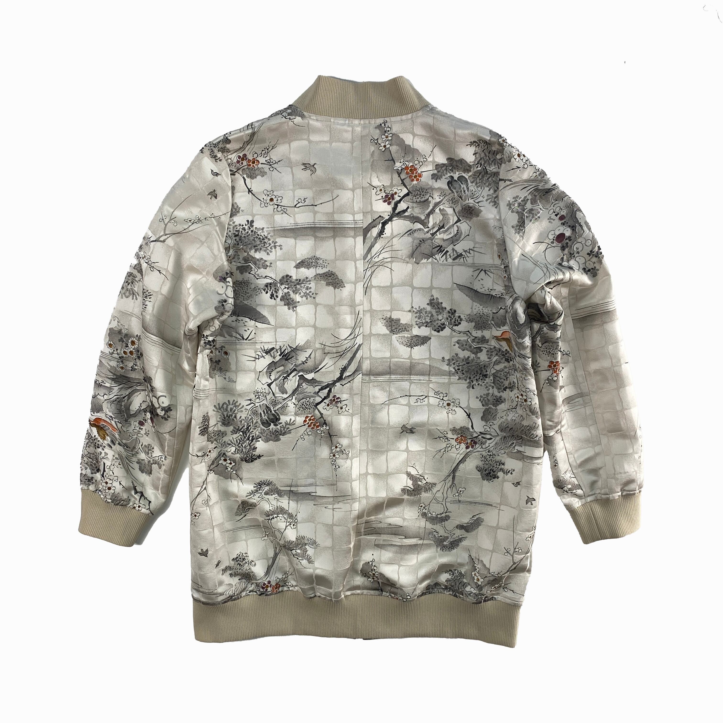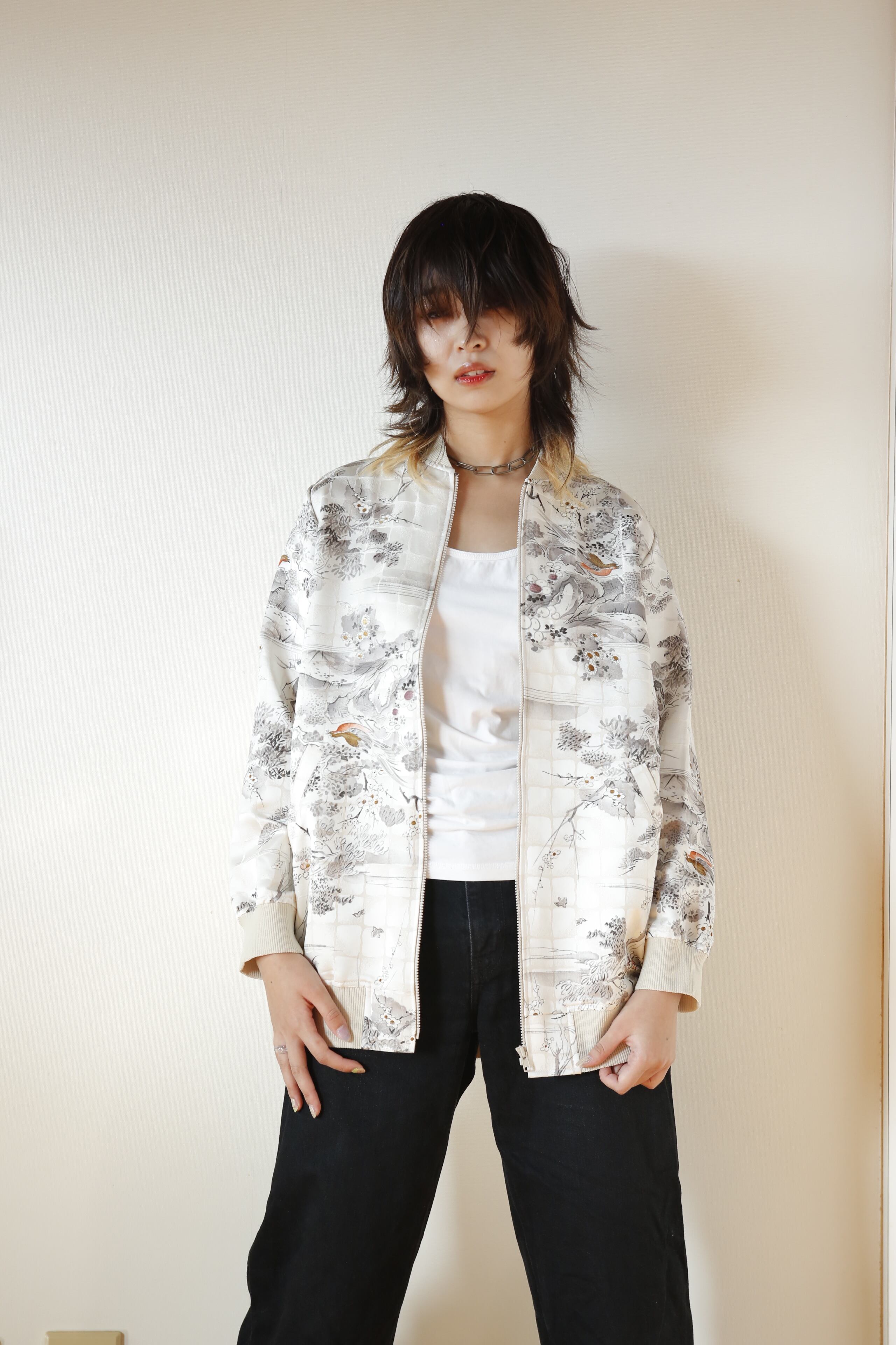 光沢のあるシルク。綸子の生地に水墨画のような絵柄が描かれた、絵画的な一枚のブルゾンです。白地に描かれた草木や小鳥たちは、繊細で美しい表現がされており、まるで日本の伝統的な絵画を着ているかのような気持ちになれます。地紋も綸子の生地の特徴で、細かな模様が織り込まれています。
