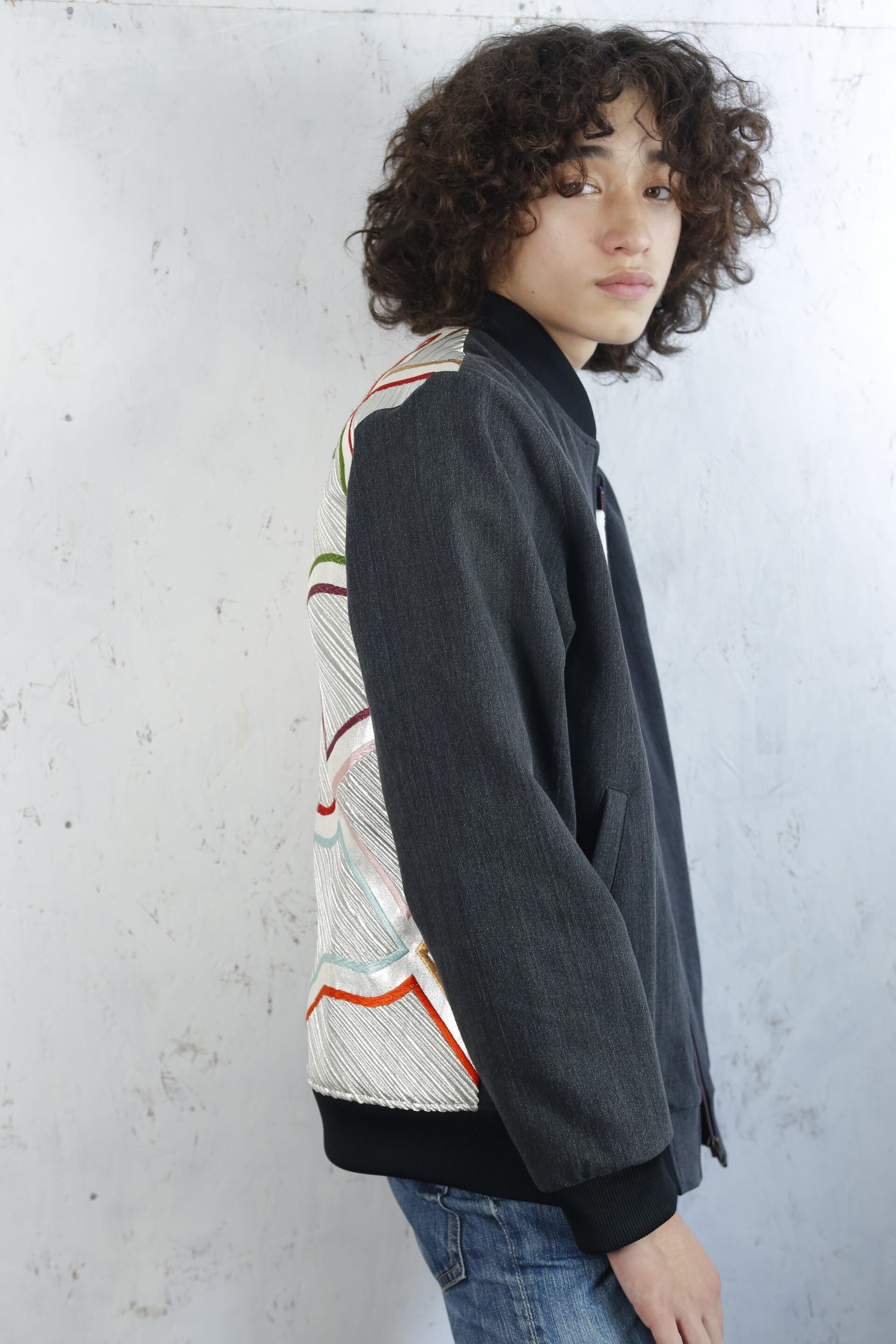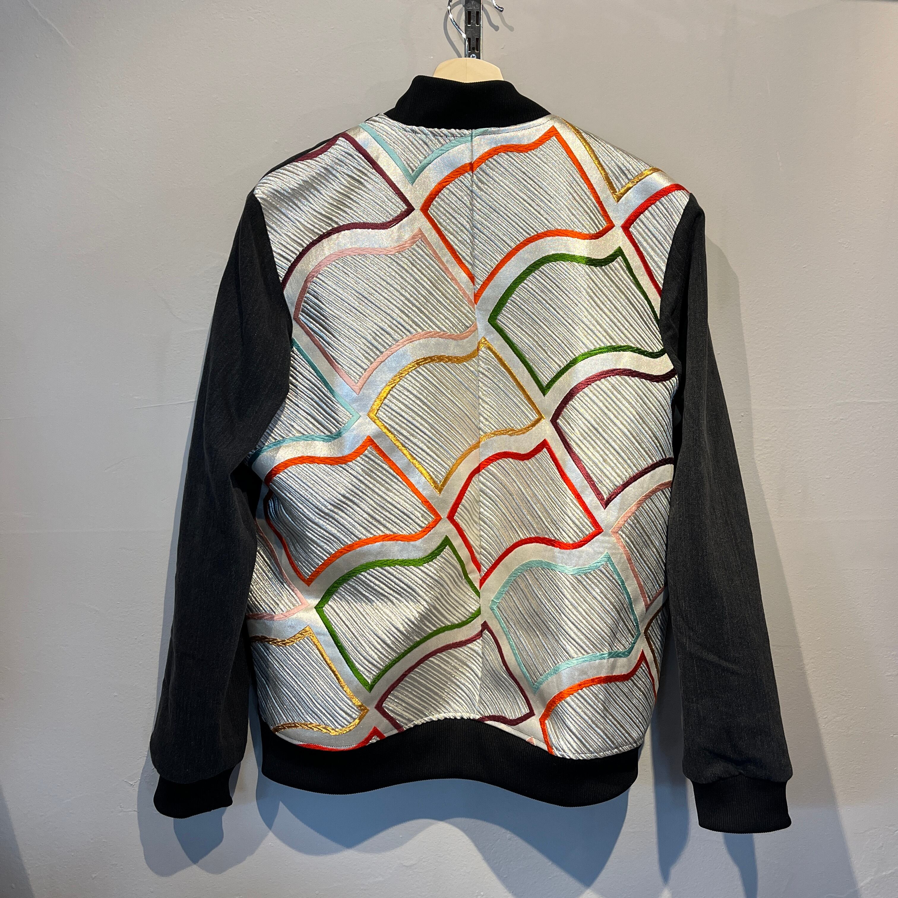 "KABUKI SILVER" is full of dynamism. A reversible blouson with a luxurious silver shine and vivid color pattern. The back is made of obi fabric, and the sleeves are lined with dark blue denim, creating a sophisticated contrast. Furthermore, the lining is made of a calming black stylish printed fabric. This item tickles your fashionable spirit.